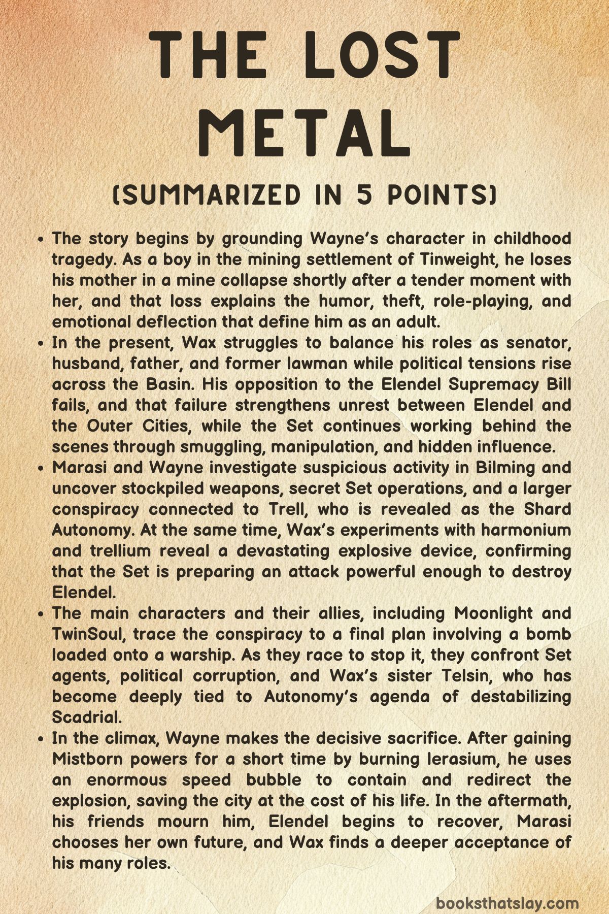 The Lost Metal is the fourth and final novel in Brandon Sanderson’s Wax and Wayne series (Mistborn Era 2), set six years after The Bands of Mourning. It blends high-stakes political intrigue, a conspiracy thriller, Allomantic action, and deep character work within the expanding Cosmere.