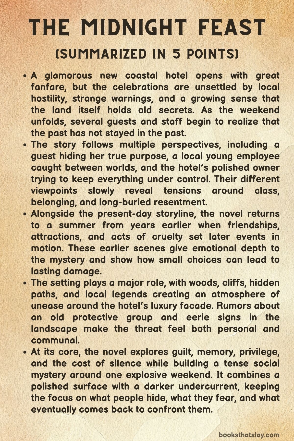 The Midnight Feast by Lucy Foley is a suspense novel set around a glamorous new hotel on the Dorset coast, where luxury, old resentments, and buried history collide over one unsettling weekend. The story moves between the hotel’s opening celebrations in and a summer from 15 years earlier, slowly revealing how the past still shapes the present.