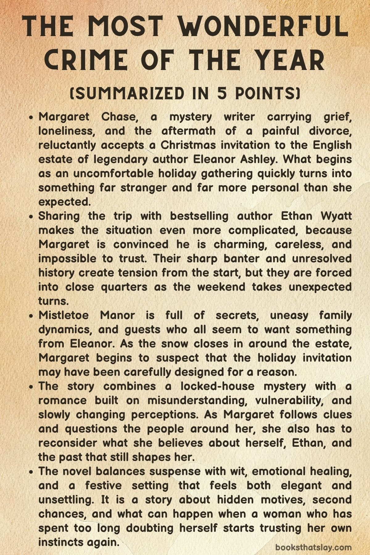 The Most Wonderful Crime of the Year by Ally Carter is a holiday romantic mystery built around a vanished author, a country manor cut off by snow, and two writers who would rather avoid each other but are forced into the same dangerous puzzle. Margaret Chase is carrying grief, loneliness, and the wreckage of a marriage, while Ethan Wyatt seems polished, charming, and impossible to read.
