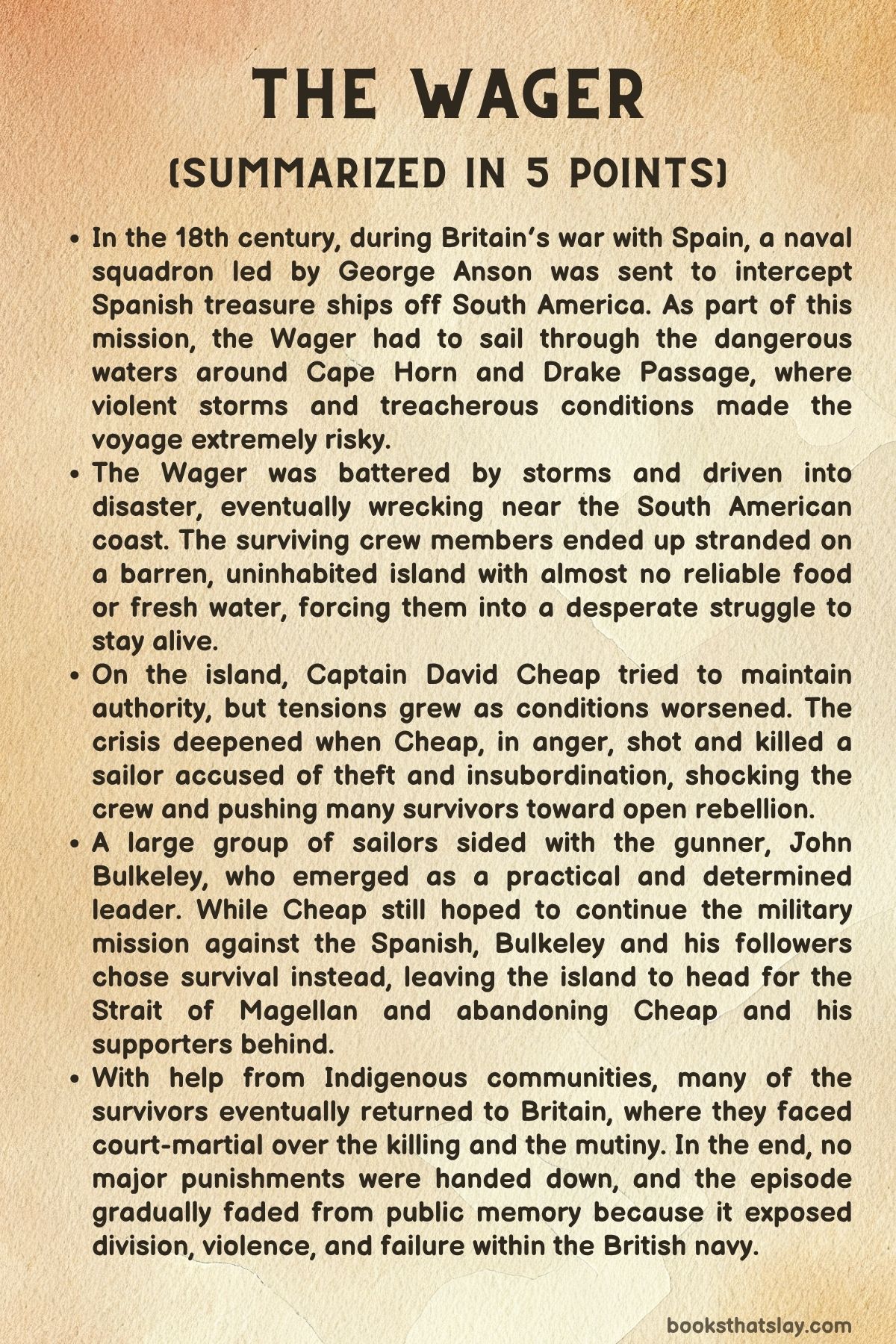 The Wager: A Tale of Shipwreck, Mutiny, and Murder begins in the early 1740s, when Britain is fighting Spain for power, trade, and imperial advantage. Commodore George Anson is given command of a naval squadron sent to the Pacific side of South America to attack Spanish interests and seize treasure.