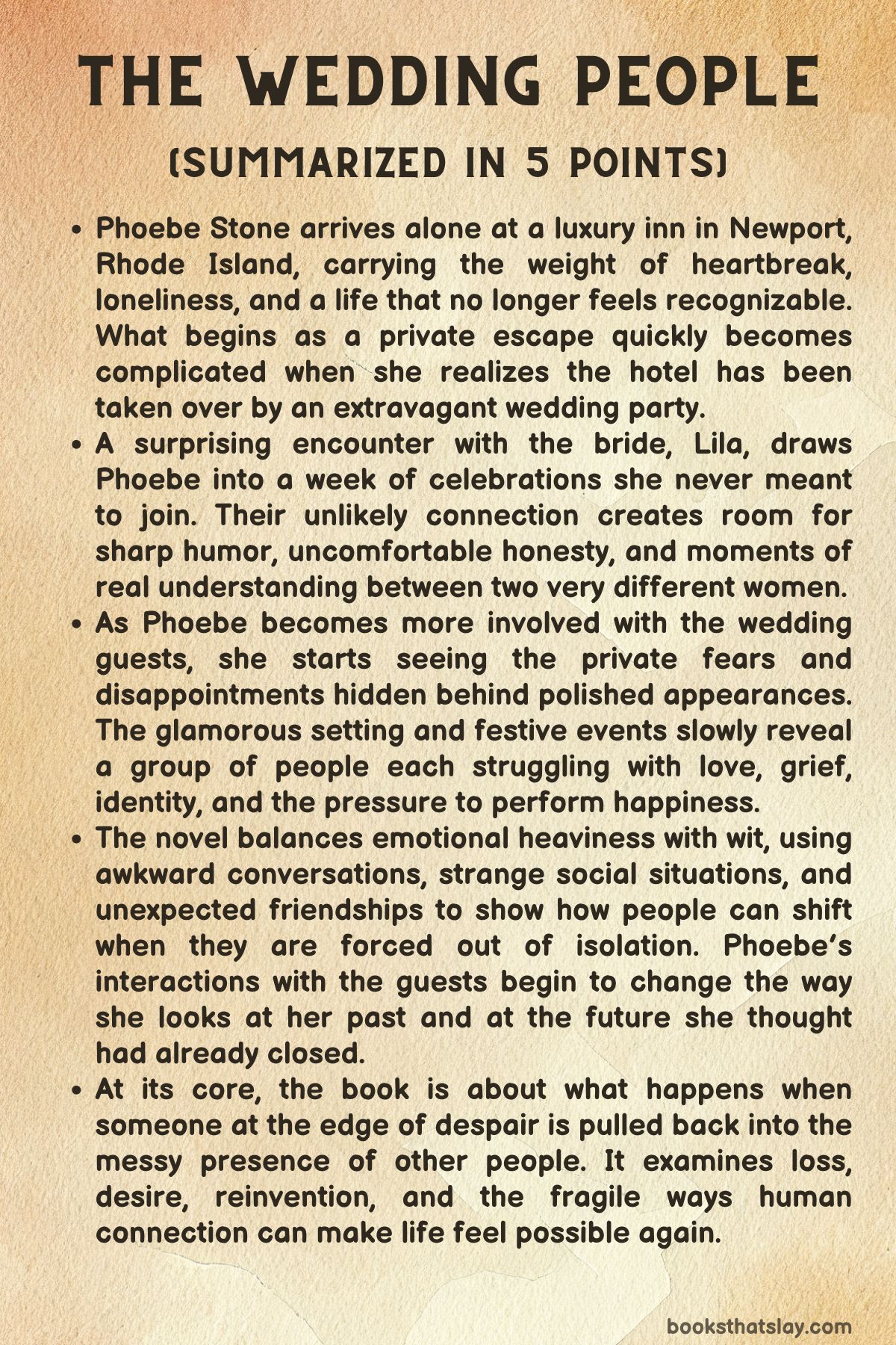 The Wedding People by Alison Espach is a sharp, funny, and emotionally alert novel about a woman who arrives at a luxury hotel carrying more pain than luggage and ends up pulled into a stranger’s wedding week. At its center is Phoebe Stone, a literature professor whose marriage, career confidence, and hopes for motherhood have all come apart.