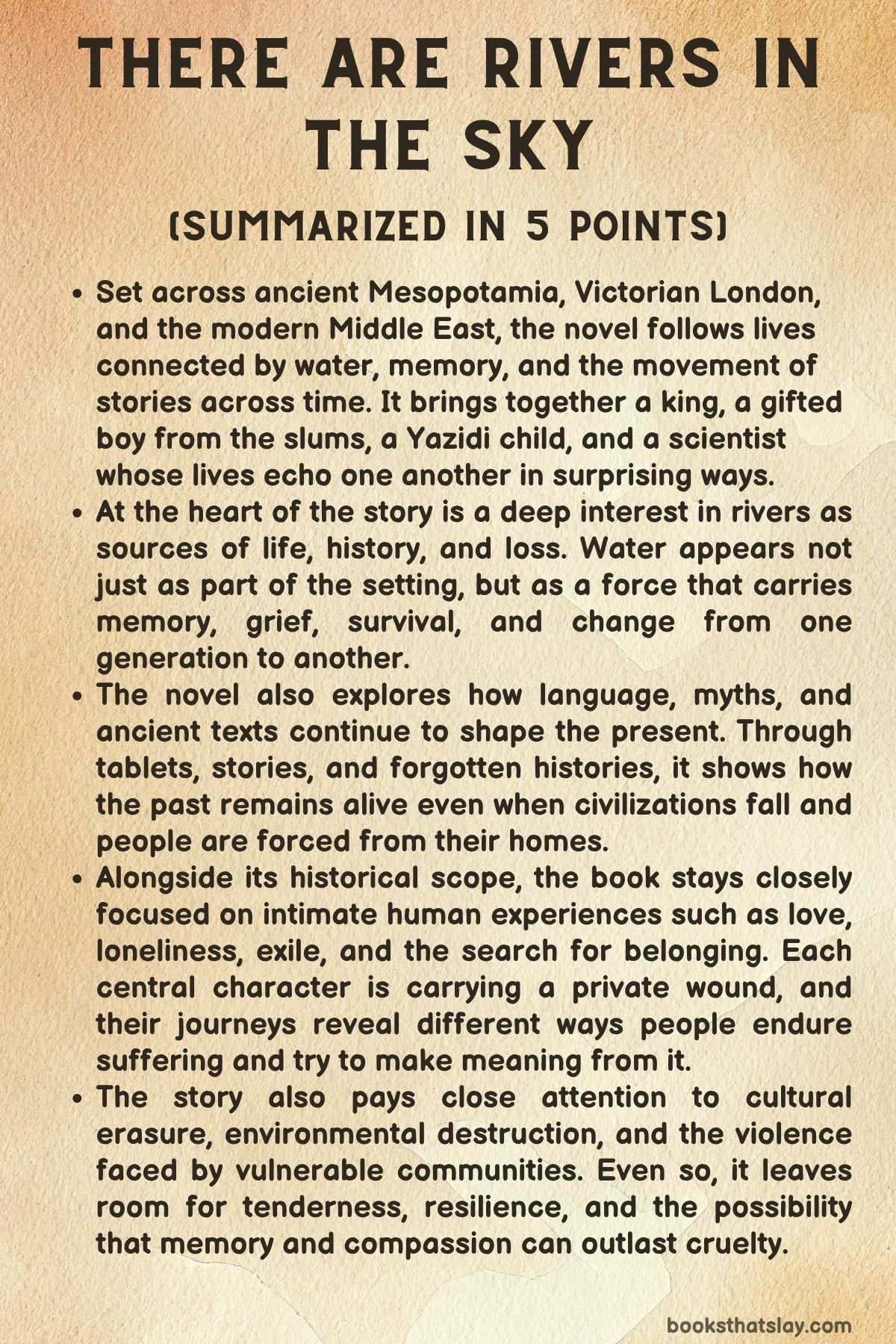 There Are Rivers in the Sky by Elif Shafak is a historical and contemporary literary novel that connects lives across centuries through water, memory, exile, and survival. Shafak brings together ancient Mesopotamia, Victorian London, and the modern Middle East to show how stories, objects, and human suffering move through time.