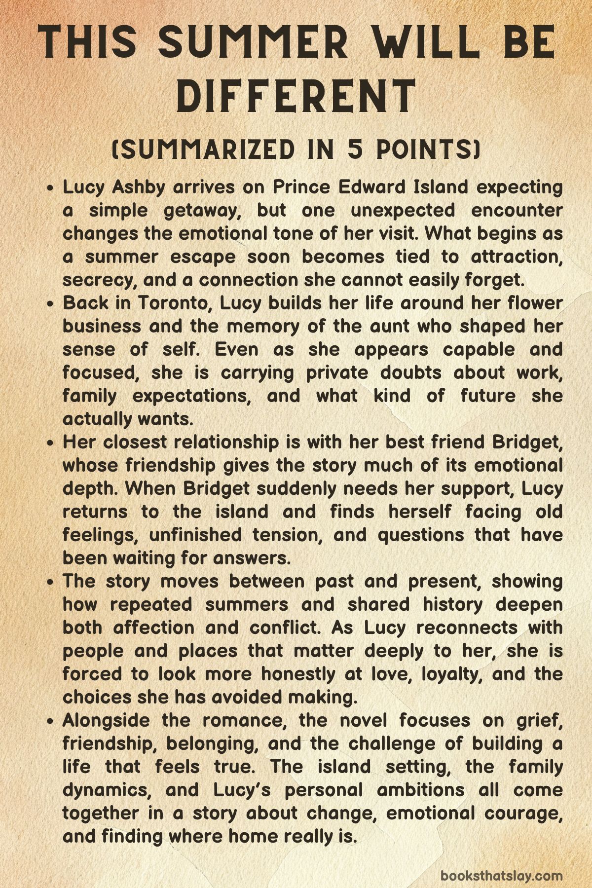 This Summer Will Be Different by Carley Fortune is a contemporary romance about love, friendship, grief, and the courage to choose a life that feels true. Set mainly on Prince Edward Island, the novel follows Lucy Ashby, a florist from Toronto whose strongest bond is with her best friend Bridget.