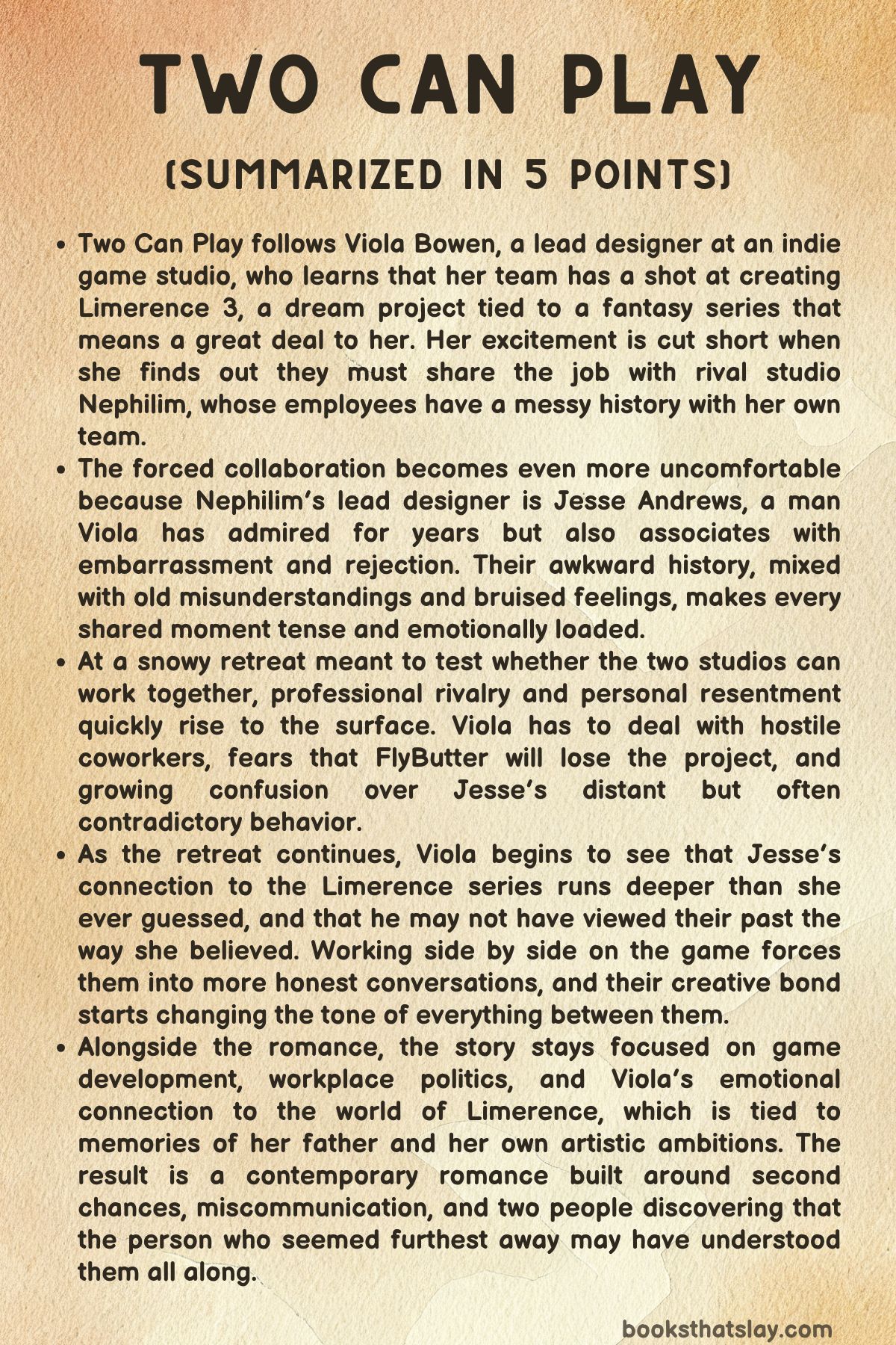 Viola Bowen enters a meeting with her boss, Mike, braced for terrible news about FlyButter Studios. Instead, she learns that StarPlay wants FlyButter to develop Limerence 3, a game based on the fantasy series that shaped her childhood and still carries deep emotional meaning because of her late father.
