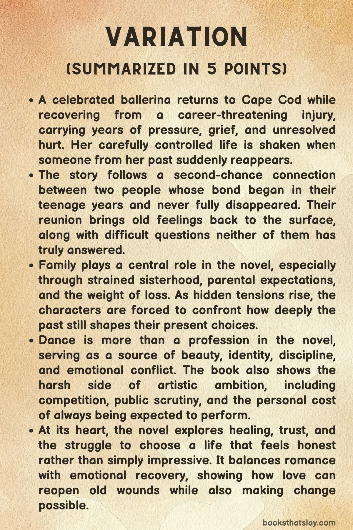 Variation by Rebecca Yarros is a contemporary romance with family drama, buried secrets, and second-chance love at its center. It follows Allie Rousseau, a celebrated ballet dancer whose career is shaken by injury, grief, and the pressure of a demanding legacy.